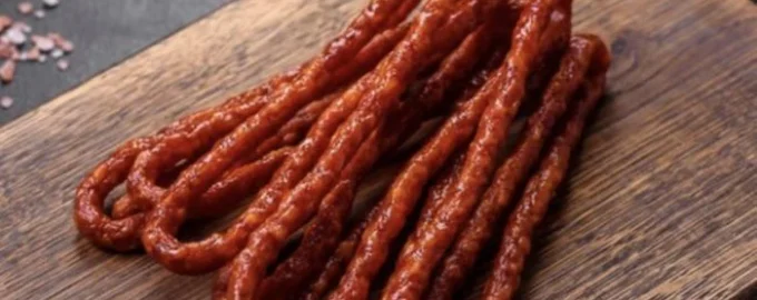 - Mleté mäso vložíme do potravinového vrecka, na dne urobíme malý otvor s hrúbkou 0,5 cm a na pergamen natlačíme tenké prúžky.